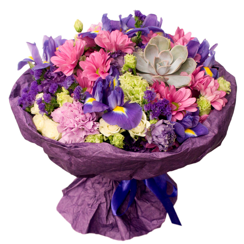 Гвоздика, ирис, хризантема кустовая, роза кустовая, статица, суккулент.