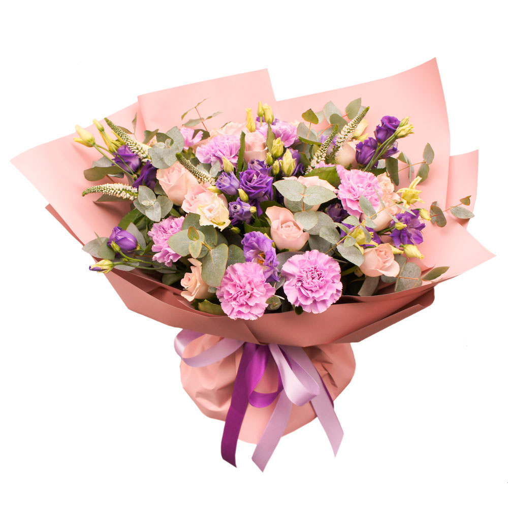Гвоздика, эустома, роза одноголовая, вероника, эвкалипт.