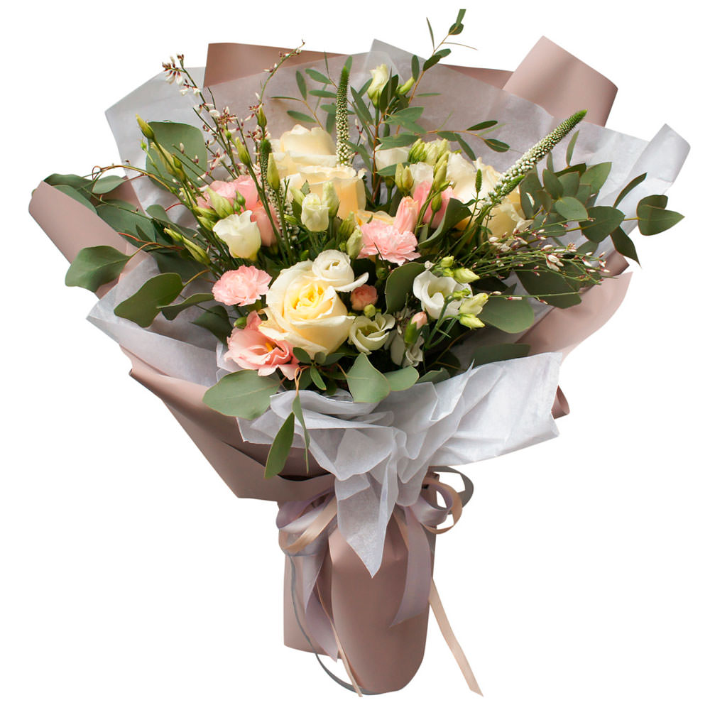 Роза одноголовая, эустома, вероника, эвкалипт.