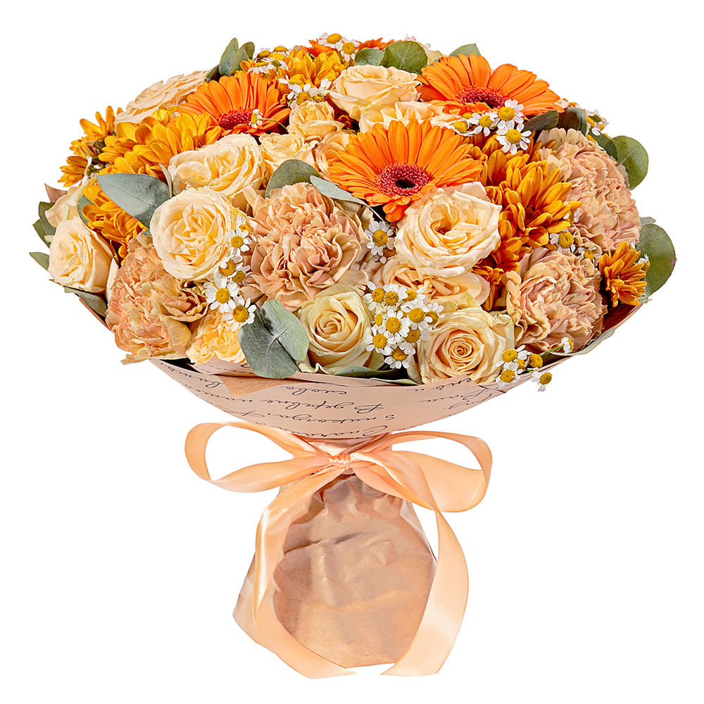 Роза одноголовая, гербера, хризантема, ромашки, эвкалипт, гвоздика.