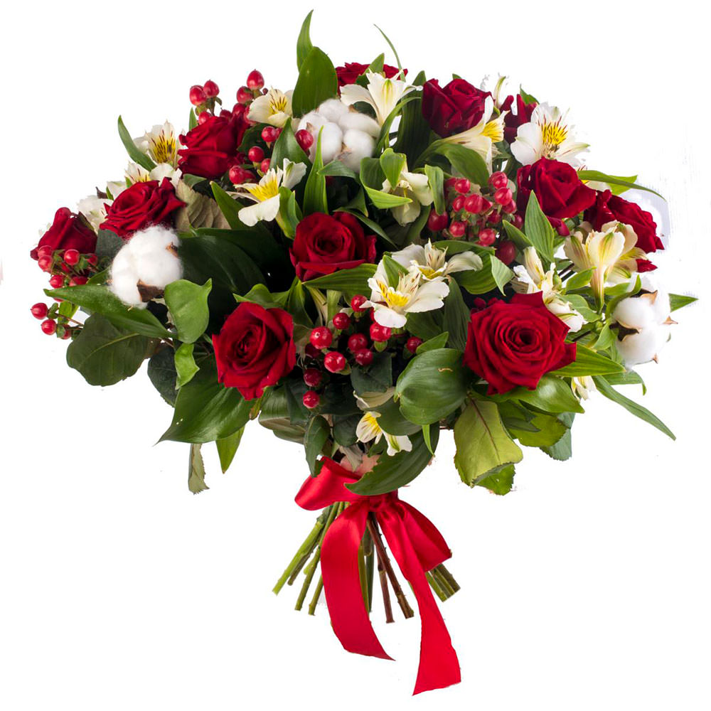 Роза одноголовая, гипперкум, альстромерия, хлоп, зелень.