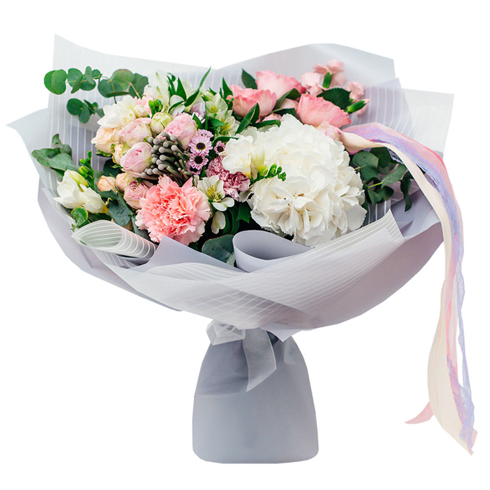 Роза, гвоздика, кустовая гвоздика, альстромерия, роза кустовая, хризантема сантини, бруния.