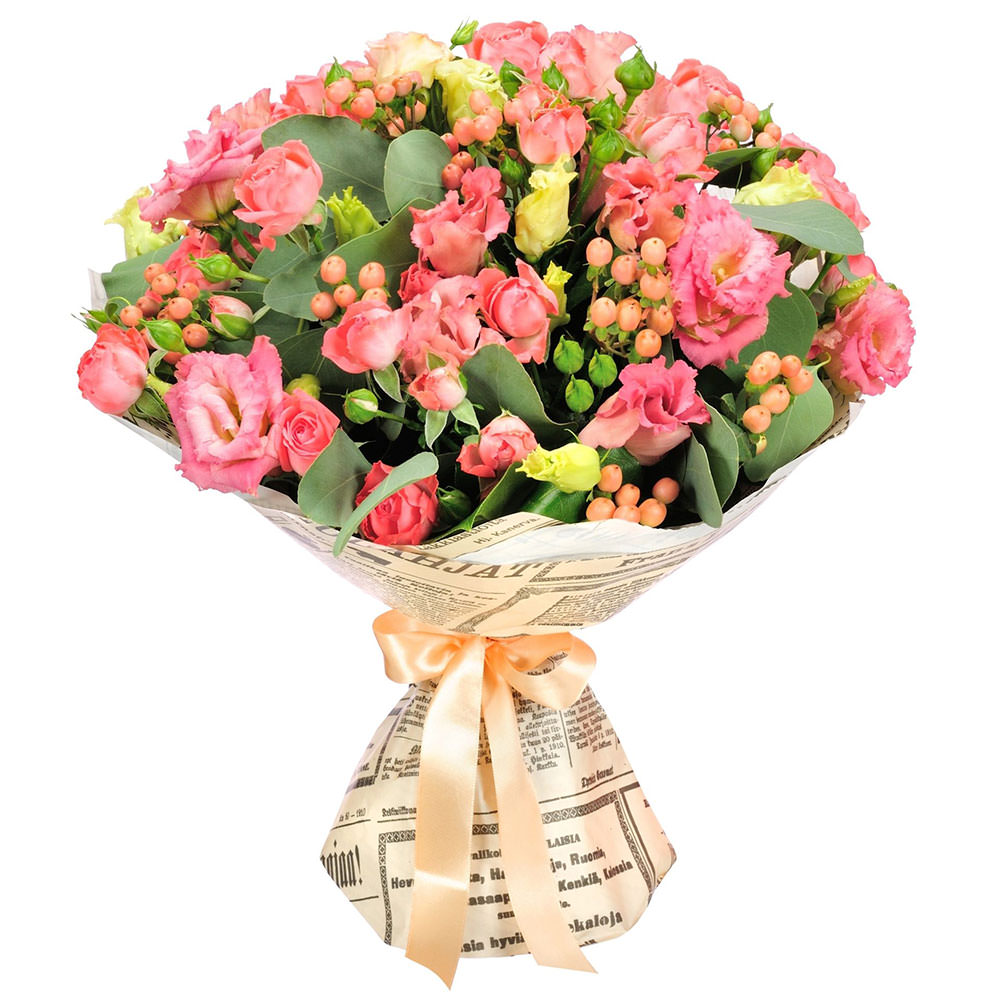 Эустома, гиперикум, роза кустовая.