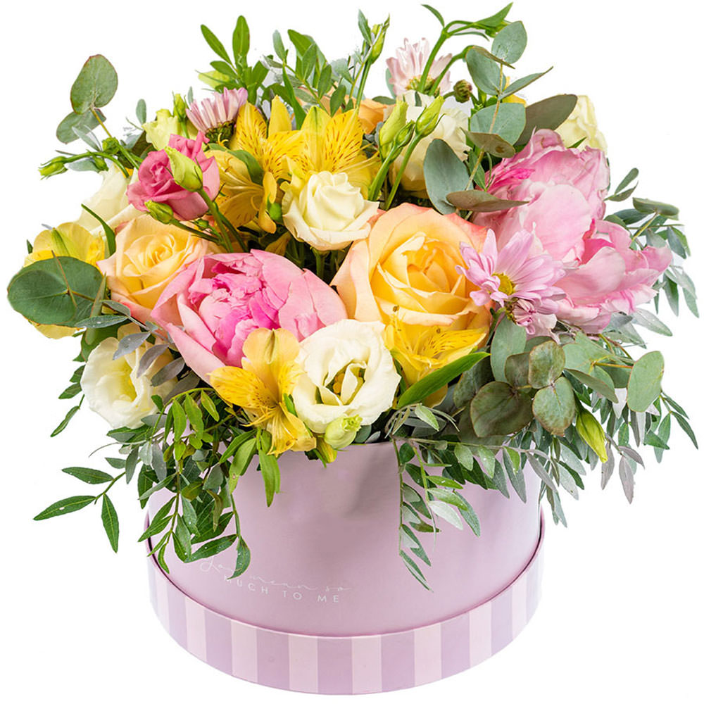 Пион, роза одноголовая, эустома, альстромерия, хризантема кустовая, самшит, эвкалипт.